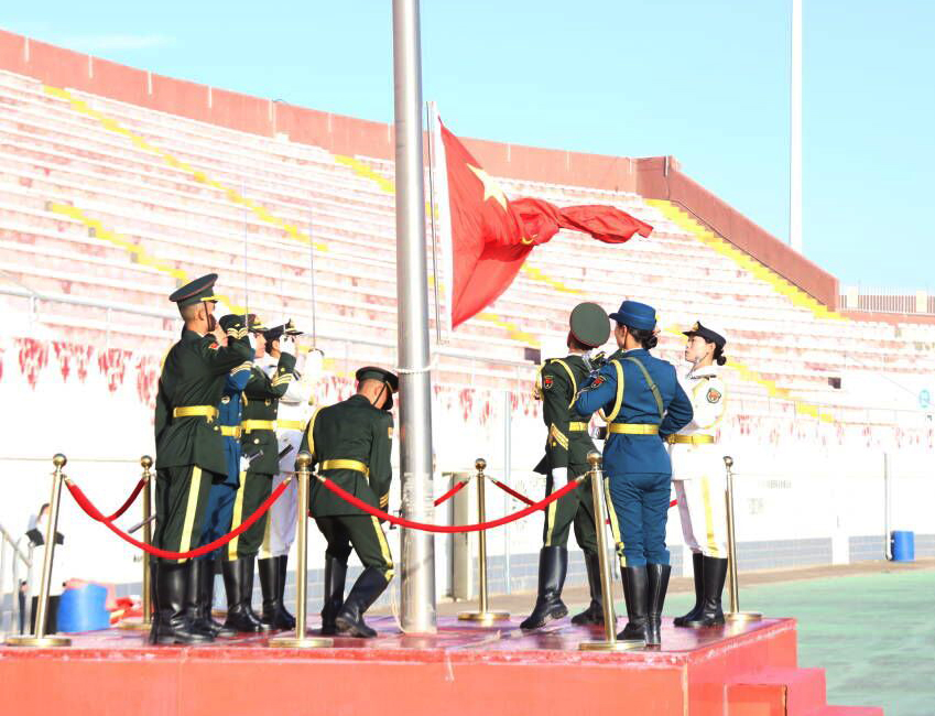 全体起立,升国旗,奏唱国歌。学校国旗护卫队迈着整齐而坚定的步伐,护送着鲜艳的五星红旗走向升旗台。伴随着激昂的国歌声奏响,全场肃立,注目着国旗缓缓升起。