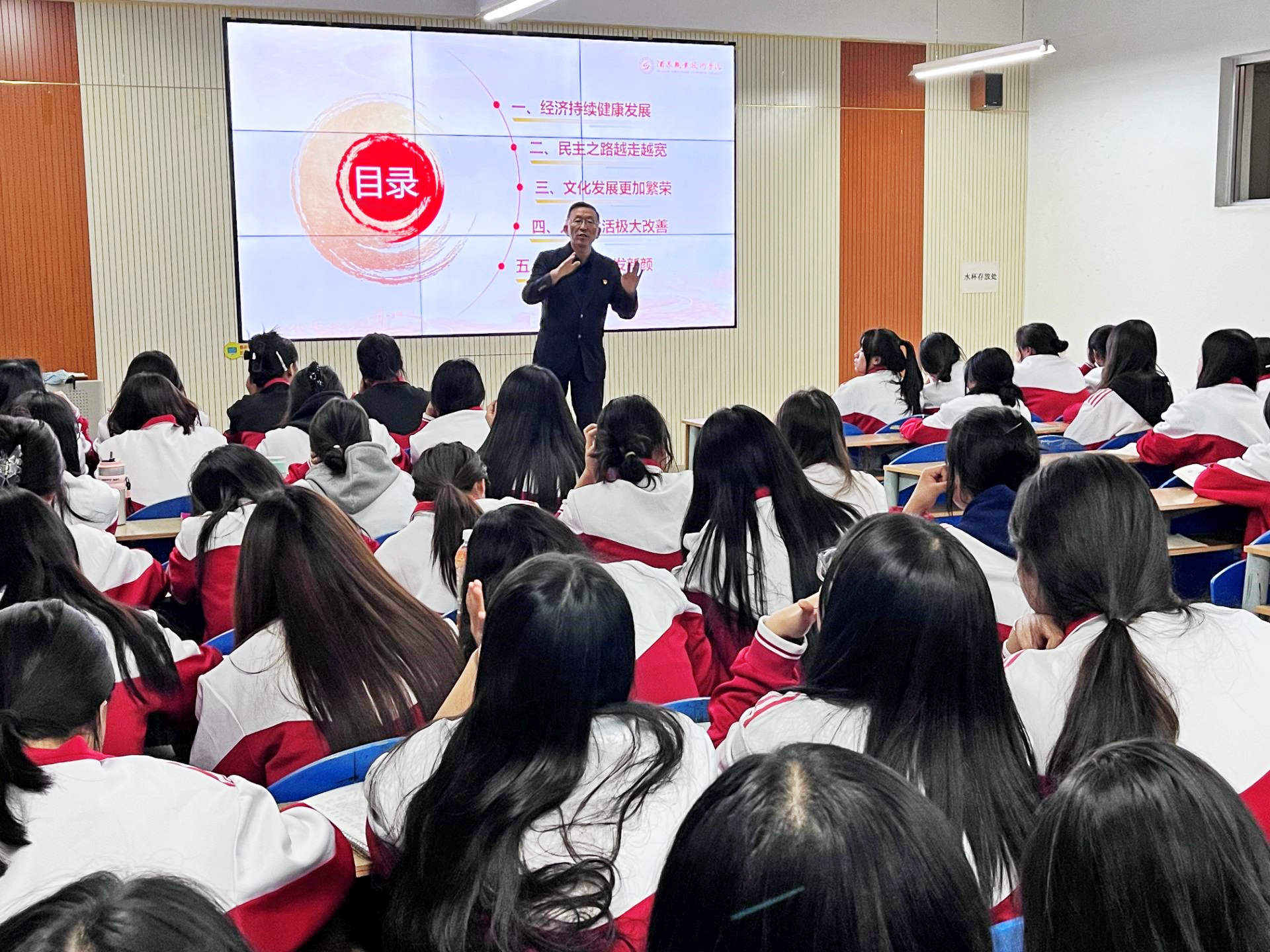 2024年11月4日,党委书记易志军以“七十五载迎盛世,砥砺前行续华章”为题,为2023级学生讲授秋季学期形势与政策第二课。