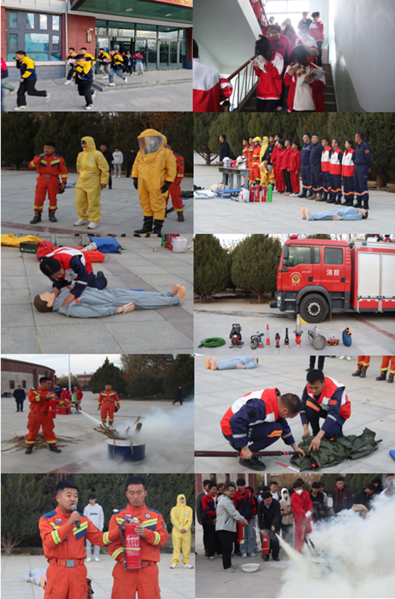 11月8日下午,随着警报声响起,演练正式拉开帷幕。第一阶段:各学院、各部门迅速进入紧急状态,根据既定应急疏散逃生方案,组织全体学生及部分教师,捂住口鼻,弯腰低姿,沿着疏散通道快速有序地疏散到安全区域。随后,各学院迅速清点各自师生人数,确保不漏一人。第二阶段:逃生演练结束后,酒泉市消防救援支队古泉特勤站消防战斗员和方舟应急救援队专业人员详细地向师生代表讲解了灭火器的操作步骤,干粉灭火器、消防水带、灭火毯的使用演示,简易担架的制作演示、心肺复苏急救演示等相关安全知识。随后,有序地组织开展了电气火灾、烹饪火灾、A类火灾等灭火演练活动。