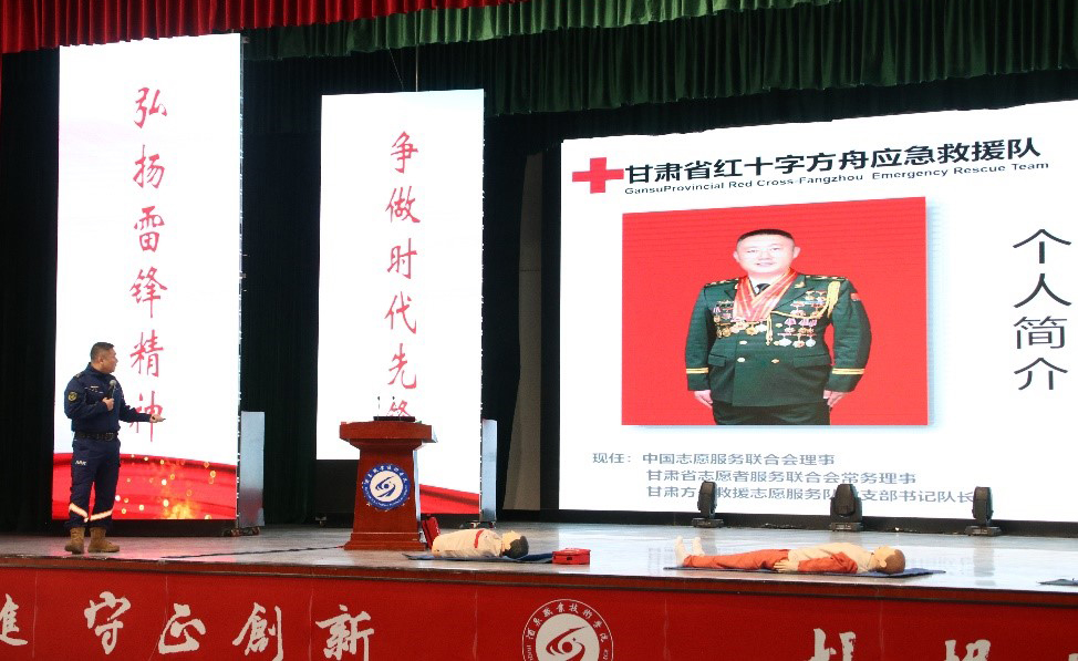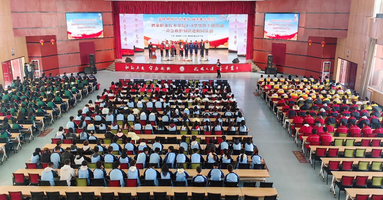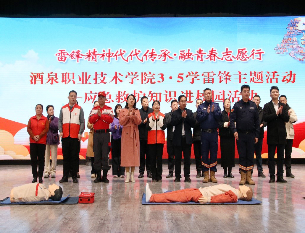 2025年3月5日,学校联合酒泉市红十字会,在胡杨文化活动中心举办“雷锋精神代代传承 融青春志愿行“3·5学雷锋”应急救护知识进校园主题活动。酒泉市红十字会专职副会长马正华,全国模范军人、甘肃省方舟救援队队长曲波,学校党委委员、副校长施荣出席活动。学校学生工作部、团委、各二级学院分管学生工作领导,师生代表共500余人参加活动。