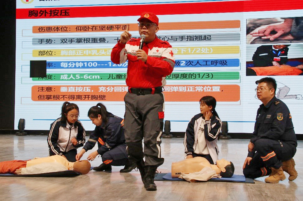 活动中,学校青年志愿者协会与酒泉红十字方舟救援队联合开展实操演练,师生在专业指导下分组练习心肺复苏(CPR)、自动体外除颤器(AED)使用、气道异物梗阻处置等标准化训练,并通过模拟地震疏散、防踩踏演练强化应急协作能力。