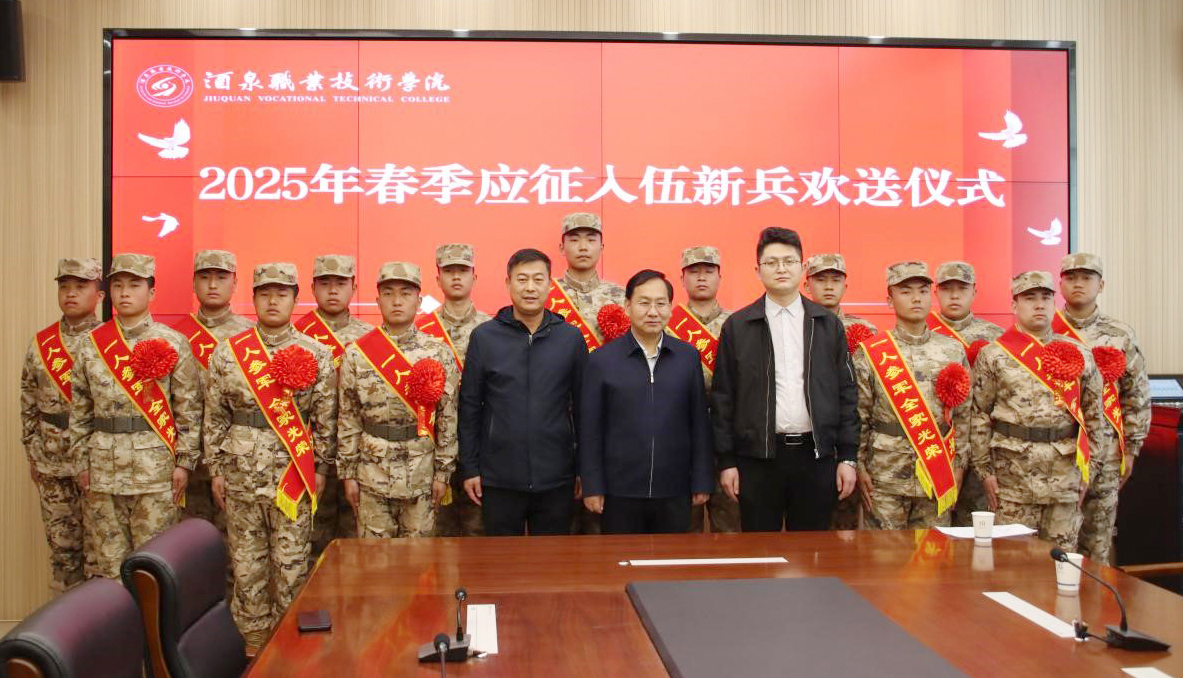 施荣在讲话中高度赞扬了入伍学子的家国情怀与使命担当,并提出三点期望,一是铸牢忠诚之魂,淬炼报国初心。要以赤子丹心铸就信仰底色,以铁血荣光践行强军誓言,做听党指挥、能打胜仗、作风优良的新时代人民卫士,用青春热血守护山河无恙、家国长安。二是砥砺担当之志,锻炼钢铁意志。要牢记“扎根大漠,荫泽苍生”的酒职精神,在军旅生涯中锻造钢筋铁骨,在逆境磨砺中厚植家国情怀,以百折不挠精神书写酒职青年担当。三是厚植奋斗之力,争当时代标兵。做好不怕困难、不畏清苦的思想准备,要有听从指挥、严格要求的强烈意识,刻苦训练、努力学习、增长才干、施展才华。他强调,学校将全力做好入伍学生的保障工作,落实优抚政策,解决后顾之忧。