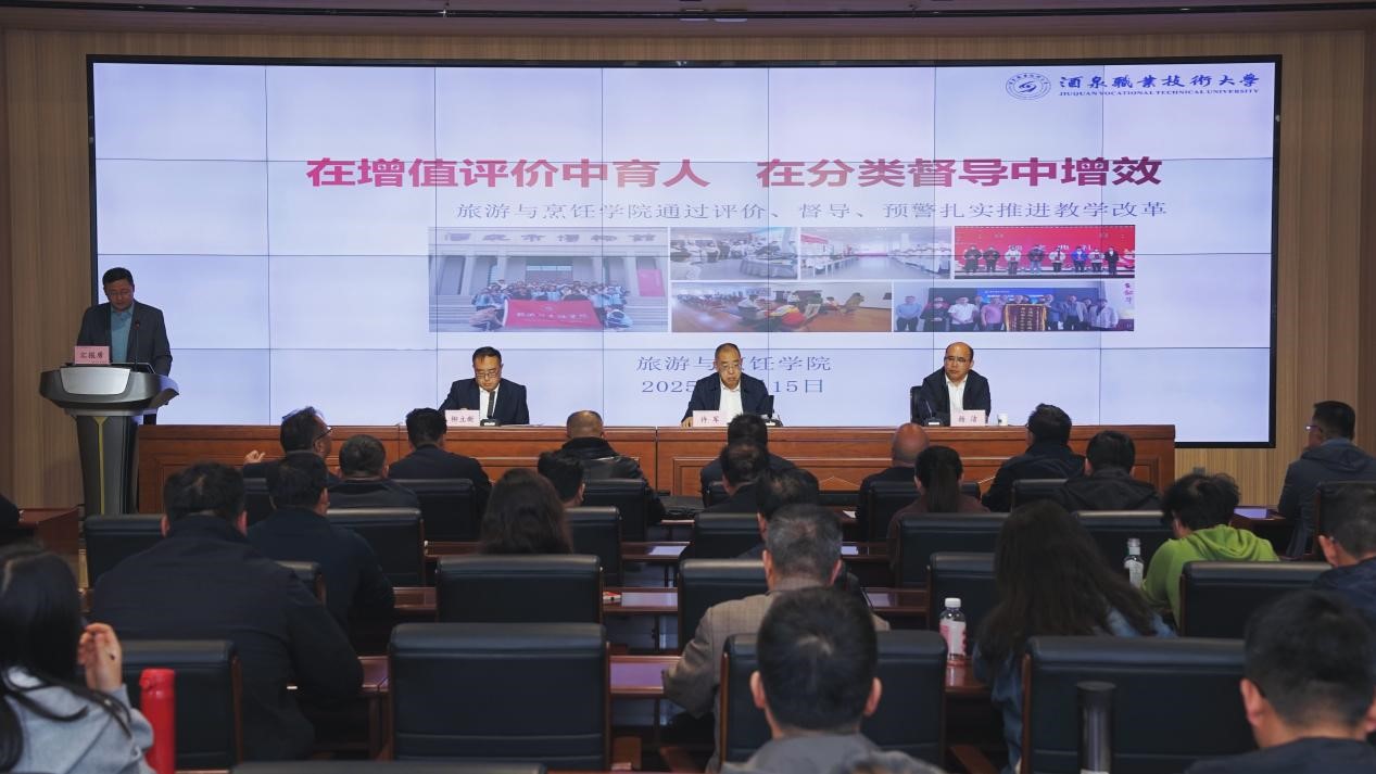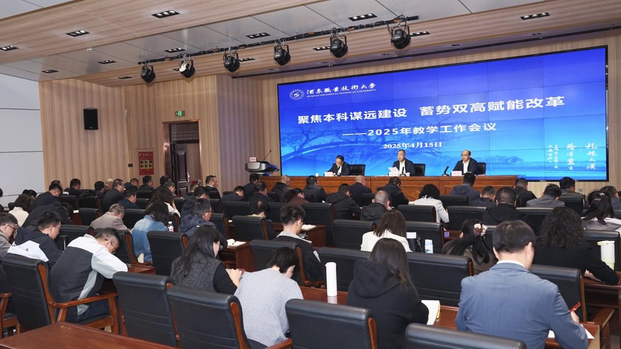 要闻快递 > 正文2025年4月15日下午,酒泉职业技术大学在弘毅楼启明厅召开2025年教学工作会议。会议以“聚焦本科谋远建设、蓄势双高赋能改革”为主题,总结了2024年工作完成情况,全面部署2025年教学重点工作任务,通过重大任务的揭榜攻坚,推动学校教育事业跨越式发展。学校党委副书记、校长许军出席会议并讲话,学校党委委员、副校长杨洁主持会议。学校教务处、督导处、各二级学院负责人、系主任及教学管理人员共90余人参会。