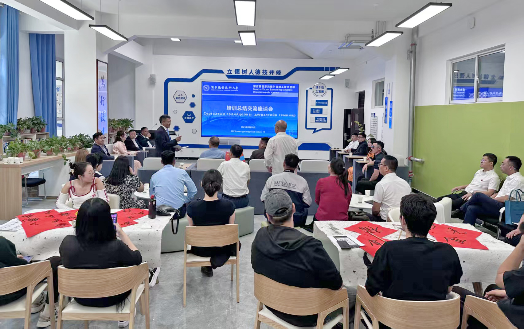 培训结束后,召开了培训成果总结会,巴特依热对先生分享了此次研学培训的收获,许军对本次活动进行了总结。双方聚焦“培黎工坊”建设,围绕蒙古国区域经济开发需求及巴彦洪格尔省理工技术学院未来发展进行了友好交流,在新能源技术、建筑工程技术、智能制造技术、信息技术应用等专业领域及数字化课程建设、学生培养、教师培训等方面达成合作意向。
