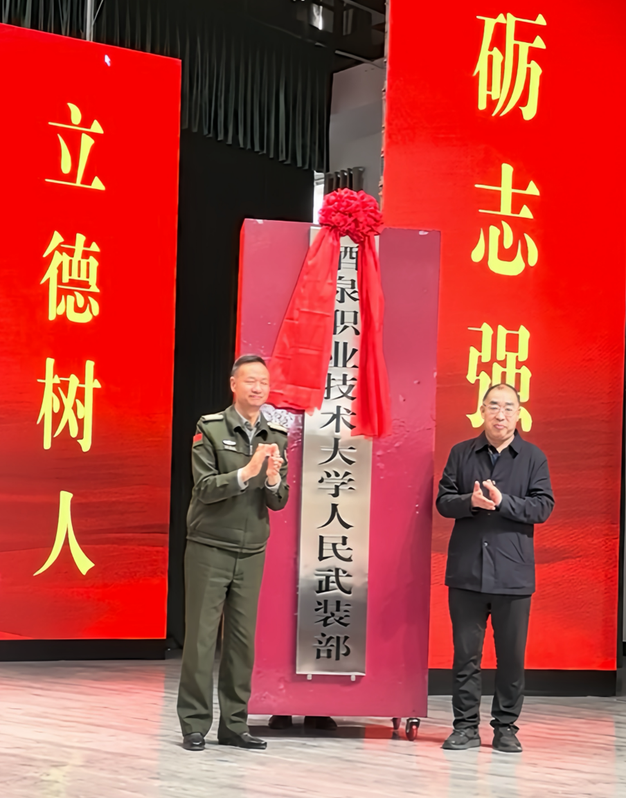 王锴奕宣读《中共酒泉市委、酒泉市人民政府、酒泉军分区关于同意在酒泉职业技术大学等7个单位设立人民武装部的批复》。李昌政与许军共同为酒泉职业技术大学人民武装部揭牌。程景峰宣读专武干部任职命令,出席领导为学校新任专武干部颁发任命书。