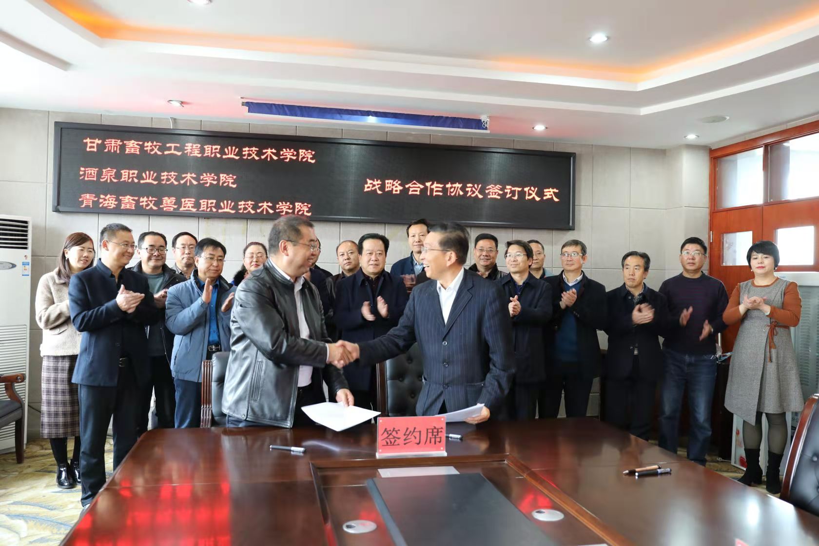 11月20日上午,酒泉职业技术学院与青海畜牧兽医职业技术学院战略合作签约仪式在青海畜牧兽医职业技术学院举行。酒泉职业技术学院党委书记、校长易志军,青海畜牧兽医职业技术学院院长马文林,副院长董永森、景建武、李建斌、赵建中,甘肃畜牧工程职业技术学院党委书记、校长杨孝列,副校长王海涛,纪委书记、监察专员张海军等领导出席了签约仪式。