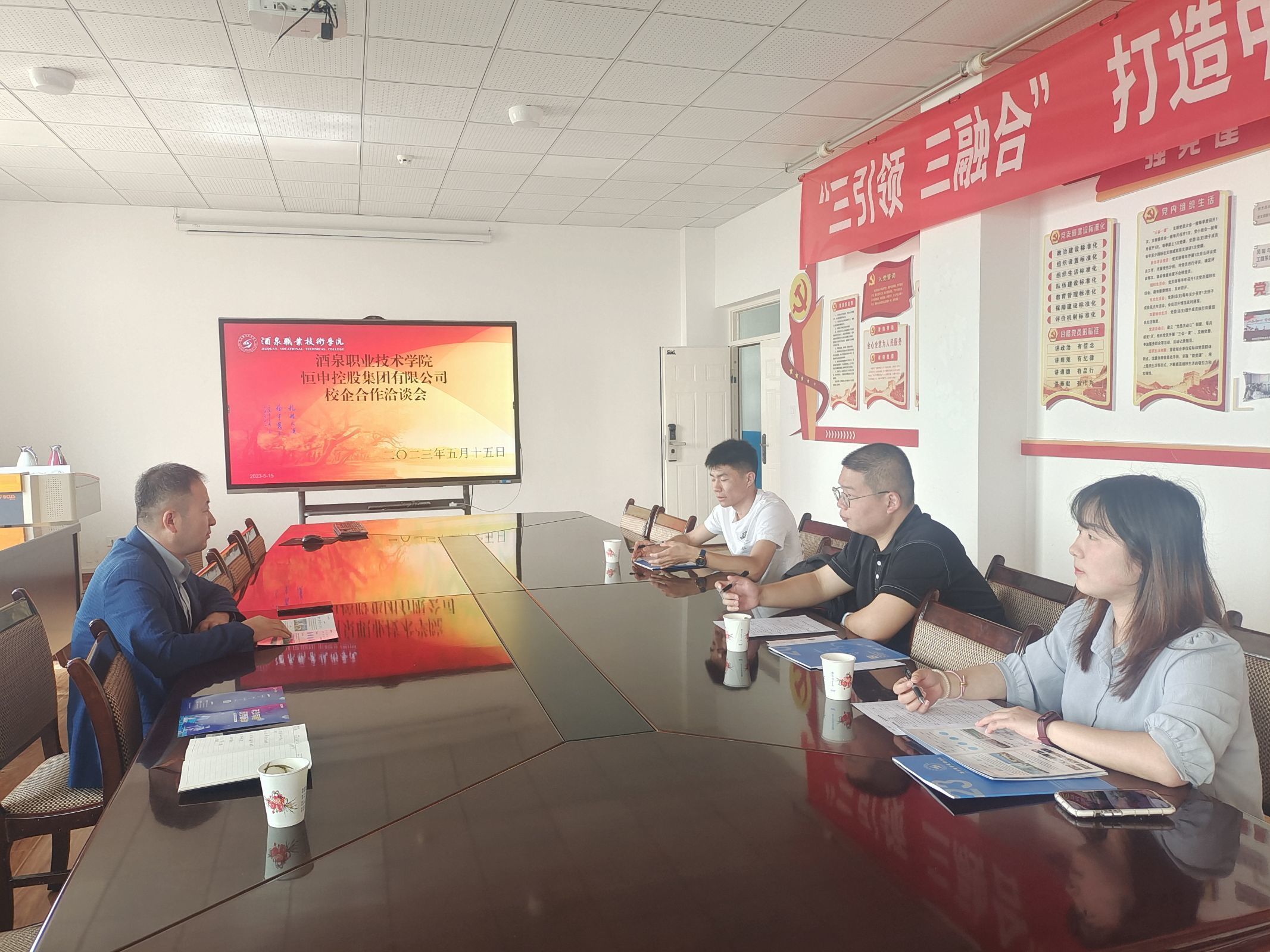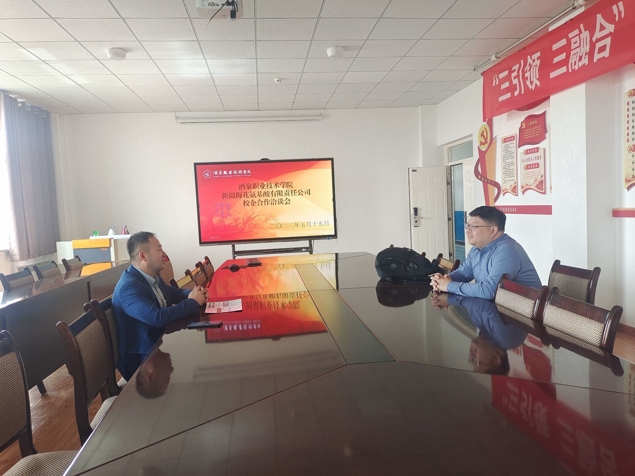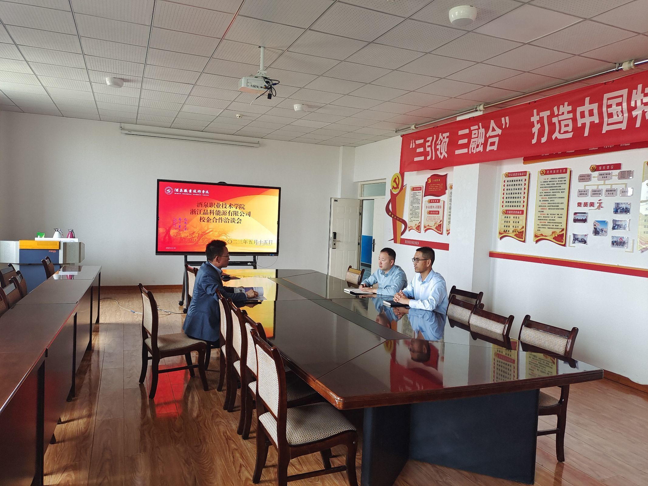 2023年5月15日,恒申控股集团有限公司人事经理张优雅、新疆梅花氨基酸有限责任公司人事经理肖遵毓、浙江晶科能源有限公司人事经理张一涵等企业代表莅临酒泉职业技术学院新能源工程学院洽谈校企合作事宜。新能源工程学院副院长张振伟与各位企业代表进行了座谈交流。