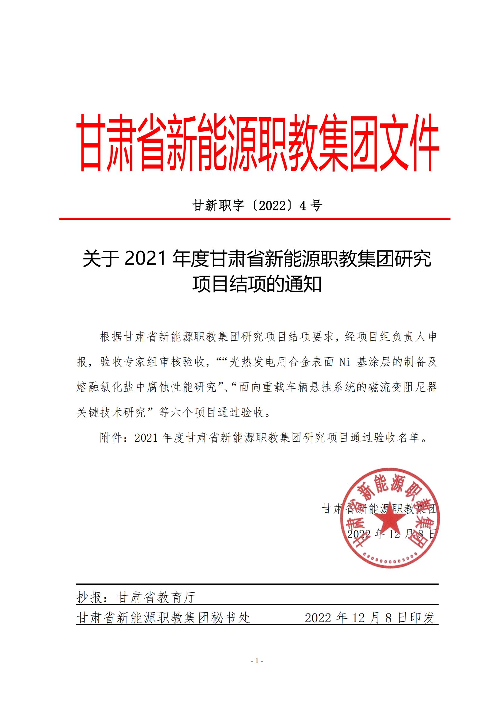 关于2021年度甘肃省新能源职教集团研究项目结项的通知