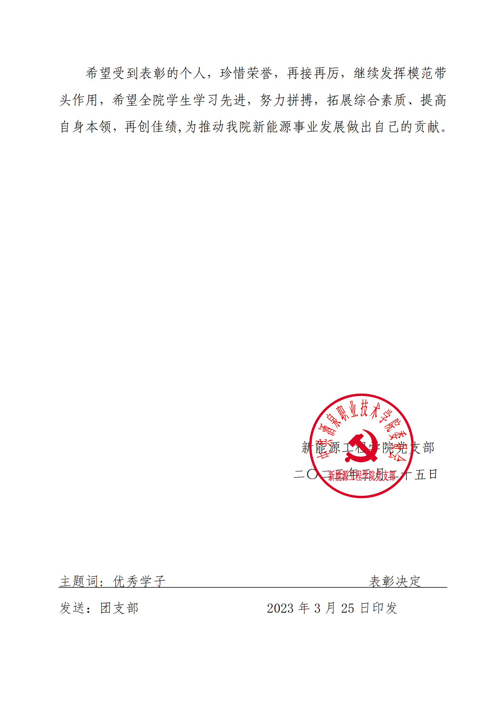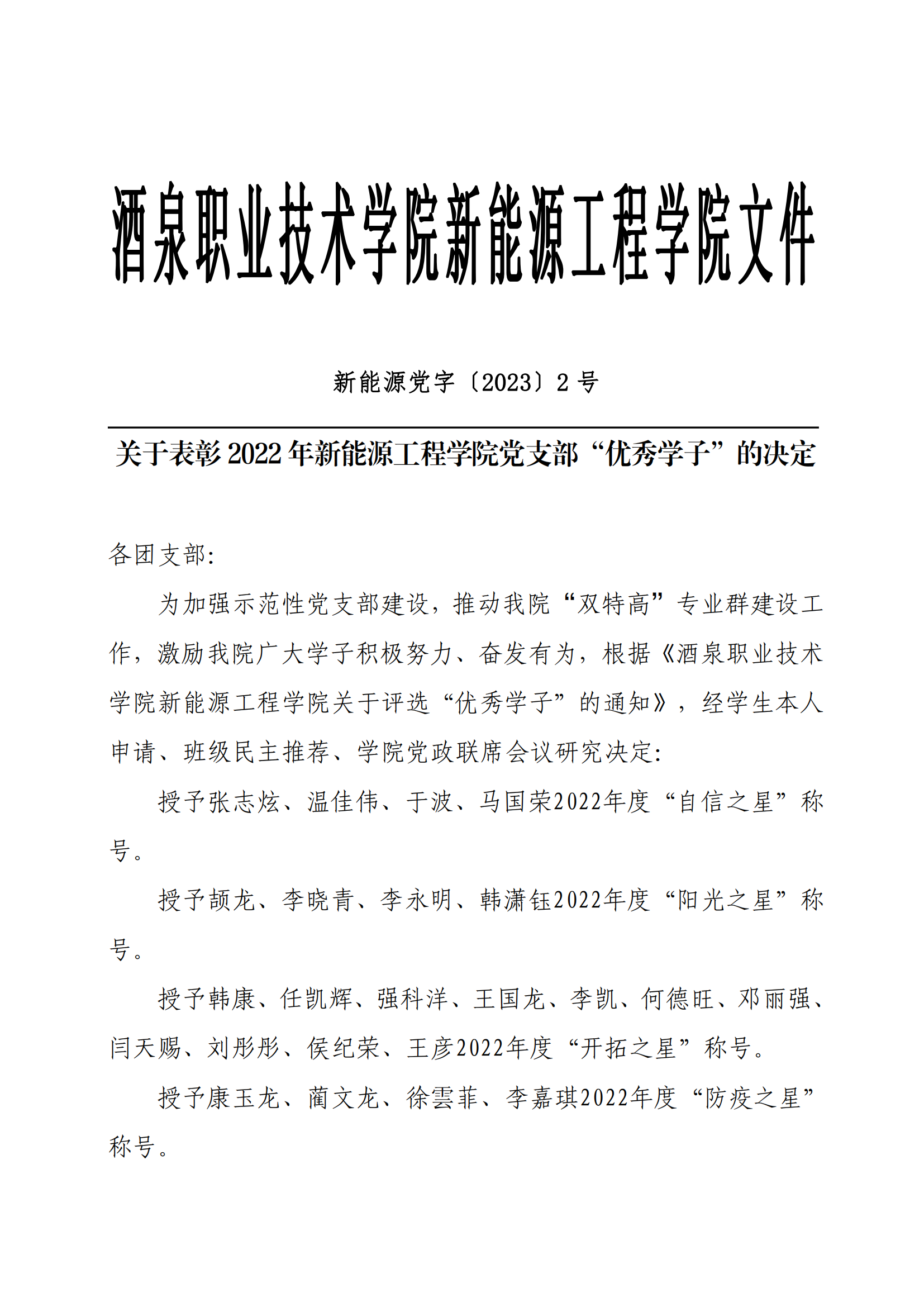 关于表彰 2022 年新能源工程学院党支部“优秀学子”的决定