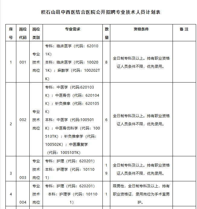 积石山县中西医结合医院招聘紧缺专业技术人员50名。具体岗位及要求见《积石山县中西医结合医院公开招聘专业技术人员计划表》(以下简称《计划表》)。